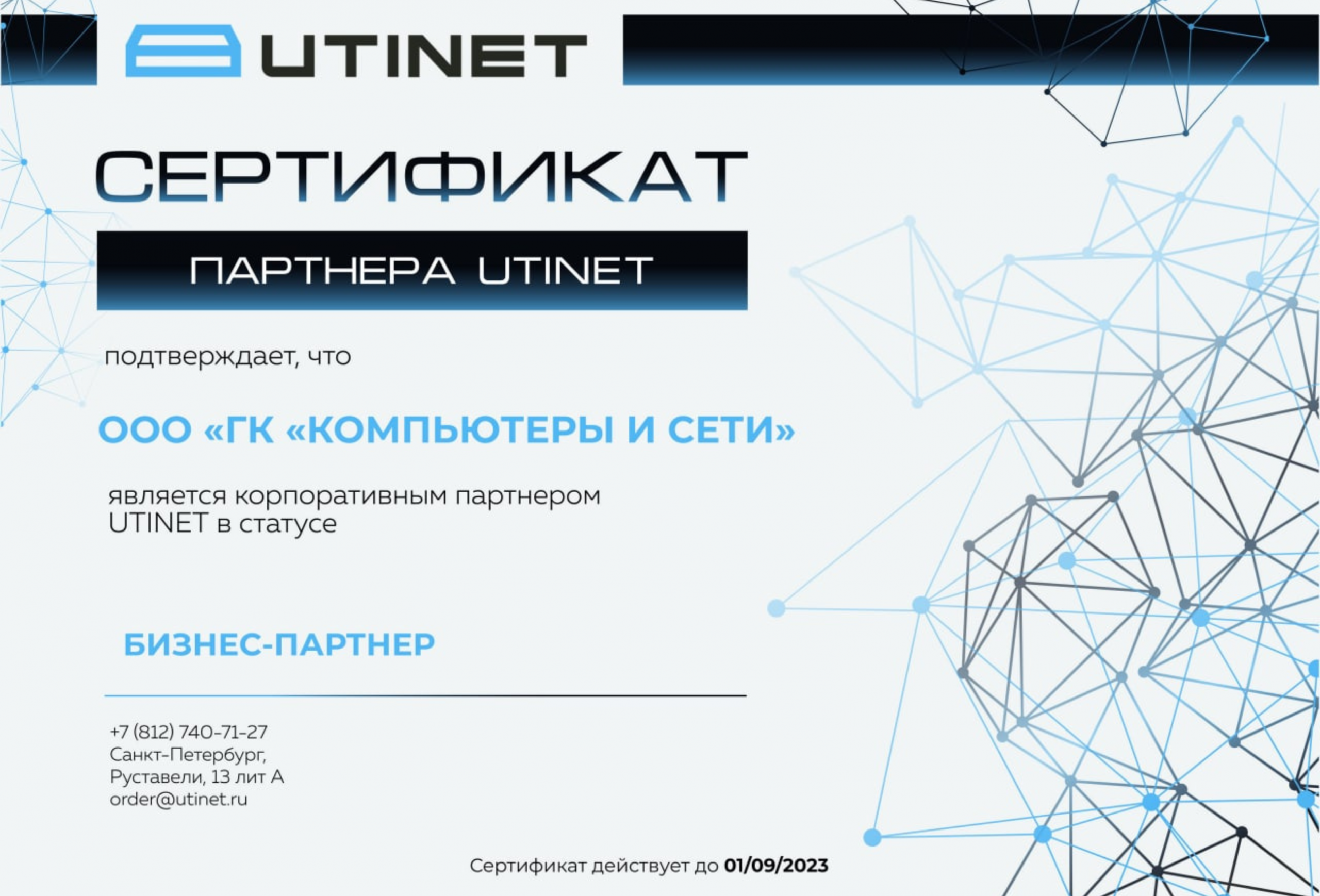 ГК «КОМПЬЮТЕРЫ И СЕТИ» получила сертификат, подтверждающий, что компания является корпоративным партнером UTINET в статусе «Бизнес-партнер».
