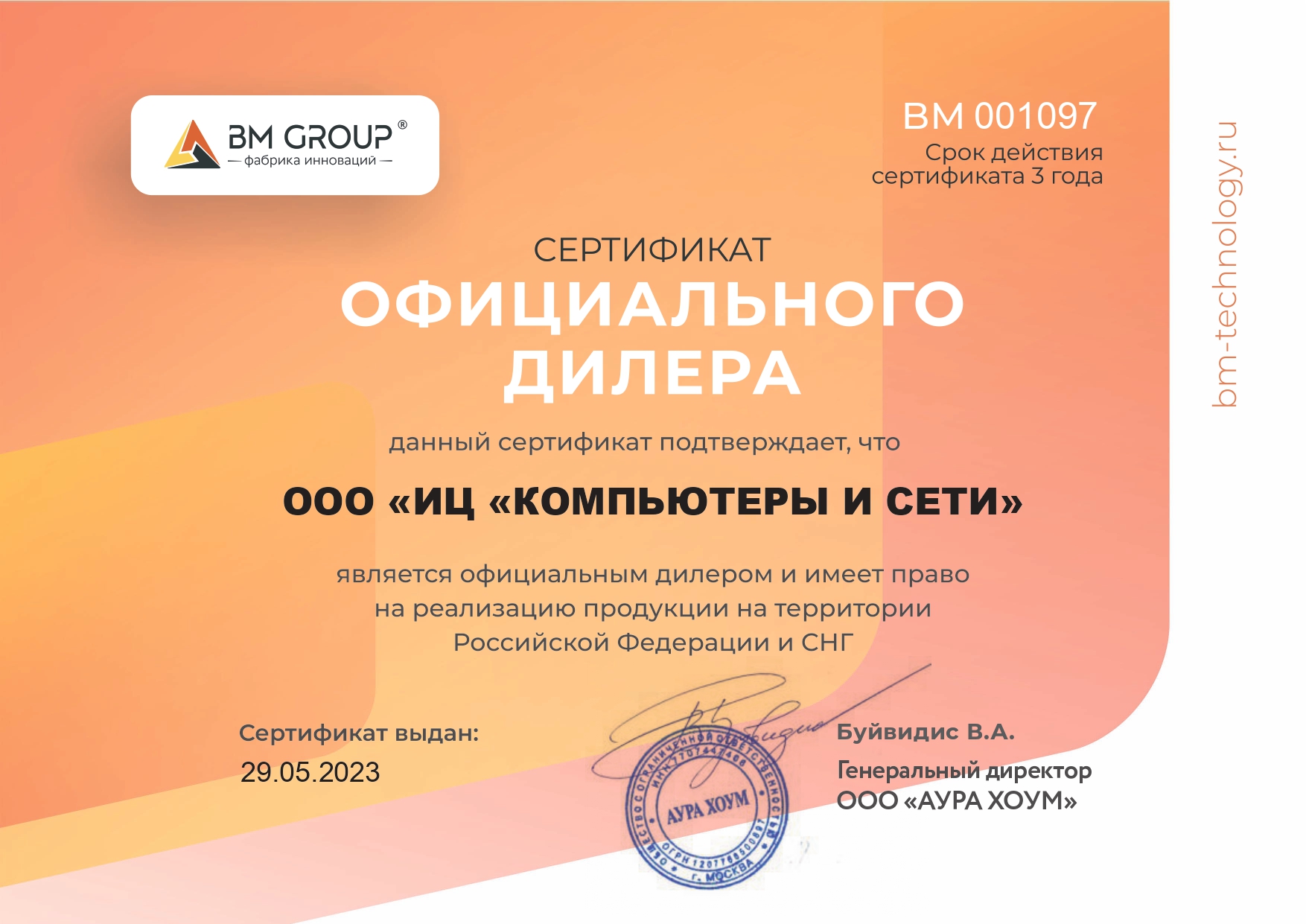 ГК «КОМПЬЮТЕРЫ И СЕТИ» получила сертификат, подтверждающий, что компания имеет статус официального дилера компании BM GROUP. Такой статус дает право на реализацию продукции компании на территории Российской Федерации.
