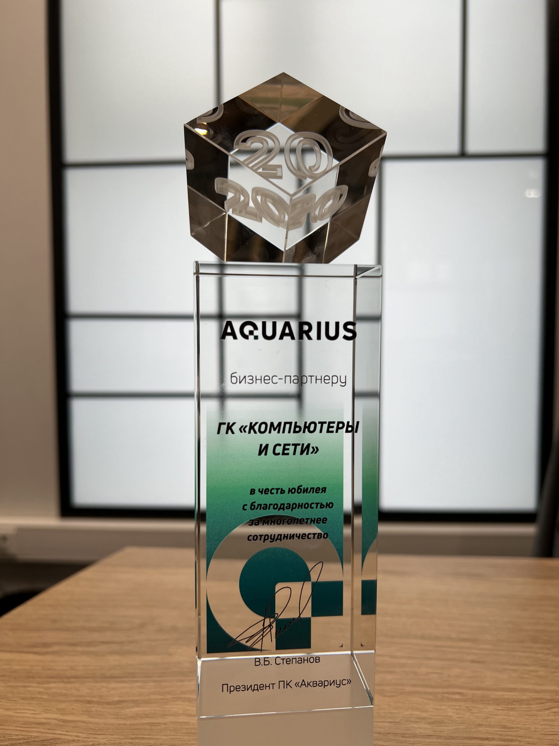На прошлой неделе ГК «КОМПЬЮТЕРЫ И СЕТИ» отметила 20-летие со дня своего основания. В честь праздника наши партнёры из компании Aquarius вручили памятную статуэтку. Коллеги выражают благодарность за многолетнее сотрудничество и поздравляют с юбилеем нашу компанию!