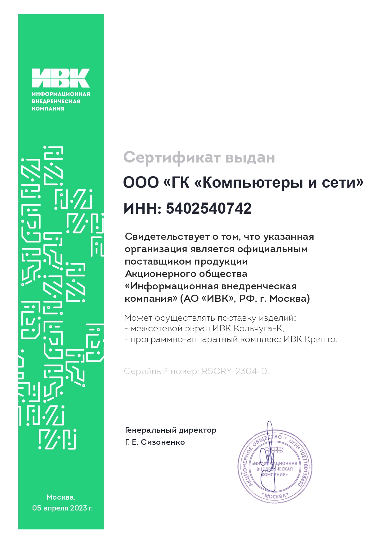 Группа компаний «КОМПЬЮТЕРЫ И СЕТИ», один из крупнейших системных интеграторов России, получила статус официального поставщика продукции «Информационной внедренческой компании» (ИВК), российского производителя компьютерной техники, системообразующего ПО и средств защиты информации. Статус подтверждает, что компания является официальным поставщиком продукции АО «ИВК» и может осуществлять поставку межсетевого экрана «ИВК Кольчуга-К» и программно-аппаратного комплекса «ИВК Крипто» на всей территории Российской Федерации. Партнерство вендора и интегратора обеспечит заказчикам принципиально новые возможности построения ИТ-инфраструктуры на основе российского программного обеспечения и оборудования.